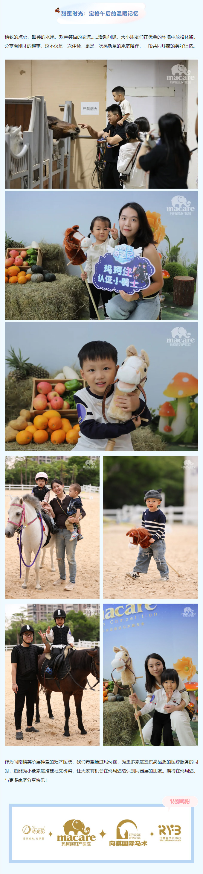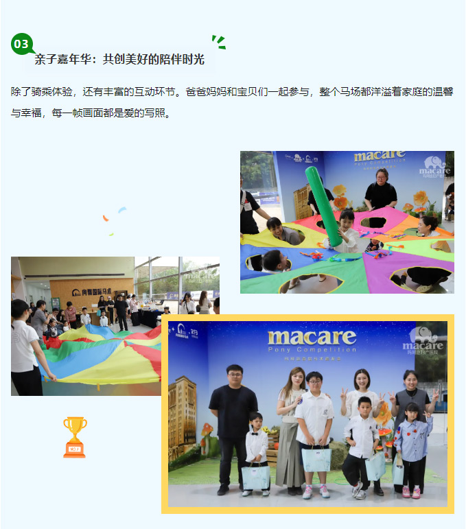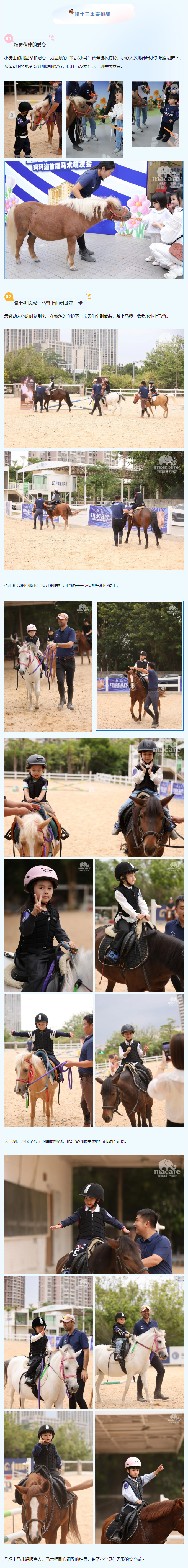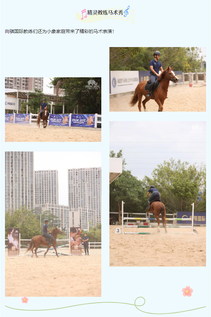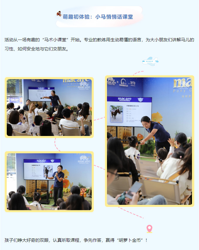 活动从一场有趣的“马术小课堂”开始。专业的教练用生动易懂的语言,为大小朋友们讲解马儿的习性、如何安全地与它们交朋友。