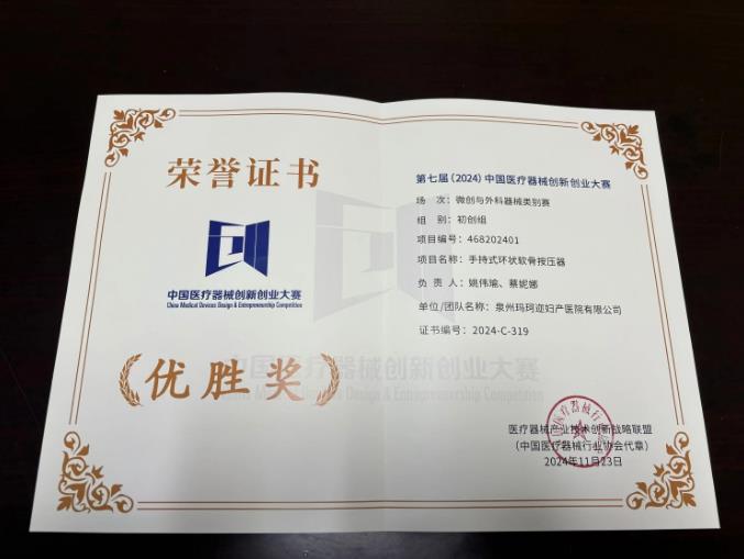 11月22日至23日,第七届(2024)中国医疗器械创新创业大赛在湖南省湘潭市圆满落幕。长沙玛珂迩妇产医院总裁兼业务院长、泉州玛珂迩妇产医院业务副院长、麻醉学主任医师——姚伟瑜凭借自主研发的手持式环状软骨按压器项目,在微创与外科器械类别赛中荣获优胜奖,标志着我院在医疗器械领域的研发实力得到了业界的广泛认可。